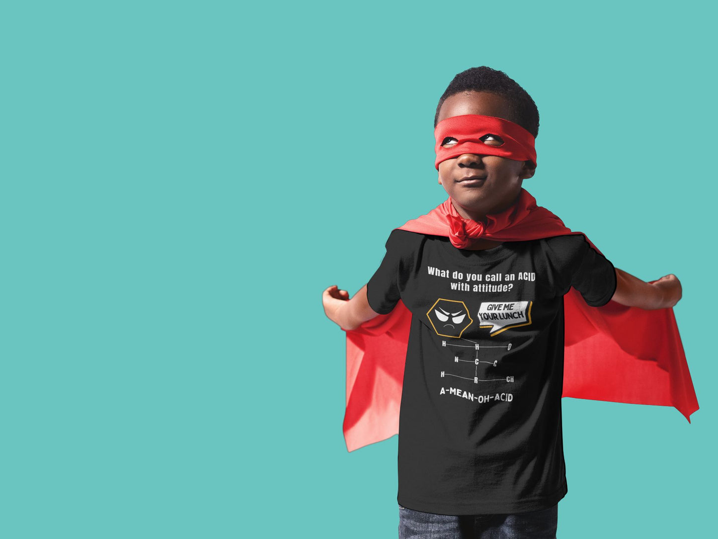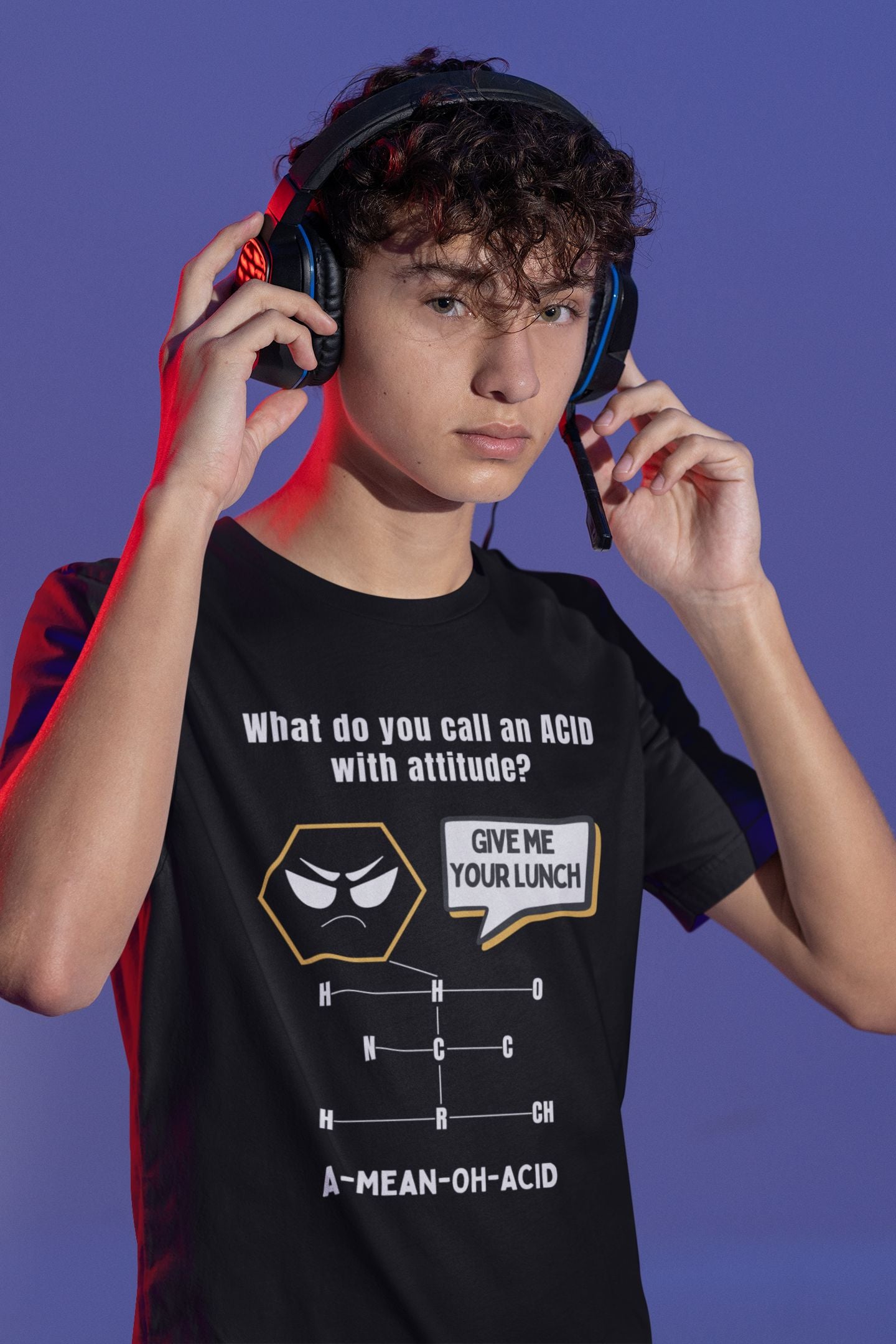 Spark your child’s curiosity with this clever chemistry-themed t-shirt! Featuring the joke “What do you call an acid with an attitude? A-mean-oh-acid!” and a comic-style amino acid character, it’s sure to bring smiles and science together.