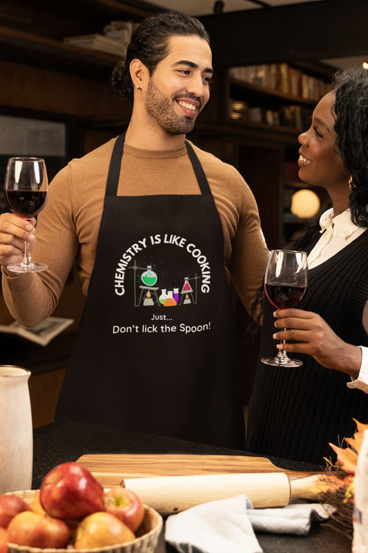 Funny Science Apron – "Chemistry Is Like Cooking... Just Don’t Lick the Spoon!" (Black, Grey, Red)