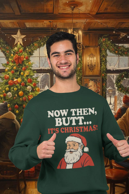 “Now Then, Butt… It’s Christmas!” Welsh Valleys Christmas Sweatshirt | Unisex Heavy Blend | Black, Navy & Forest Green