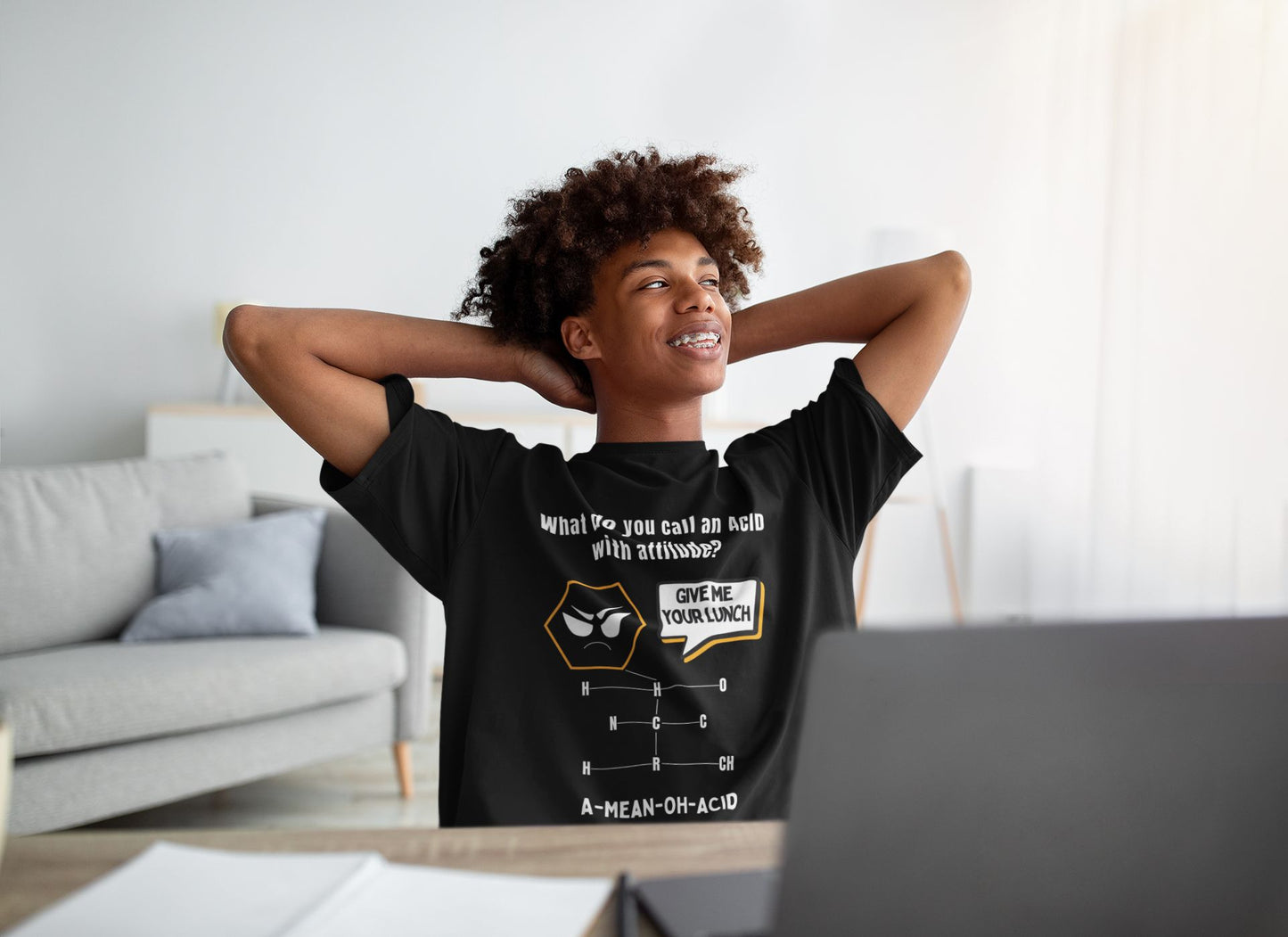 Spark your child’s curiosity with this clever chemistry-themed t-shirt! Featuring the joke “What do you call an acid with an attitude? A-mean-oh-acid!” and a comic-style amino acid character, it’s sure to bring smiles and science together.