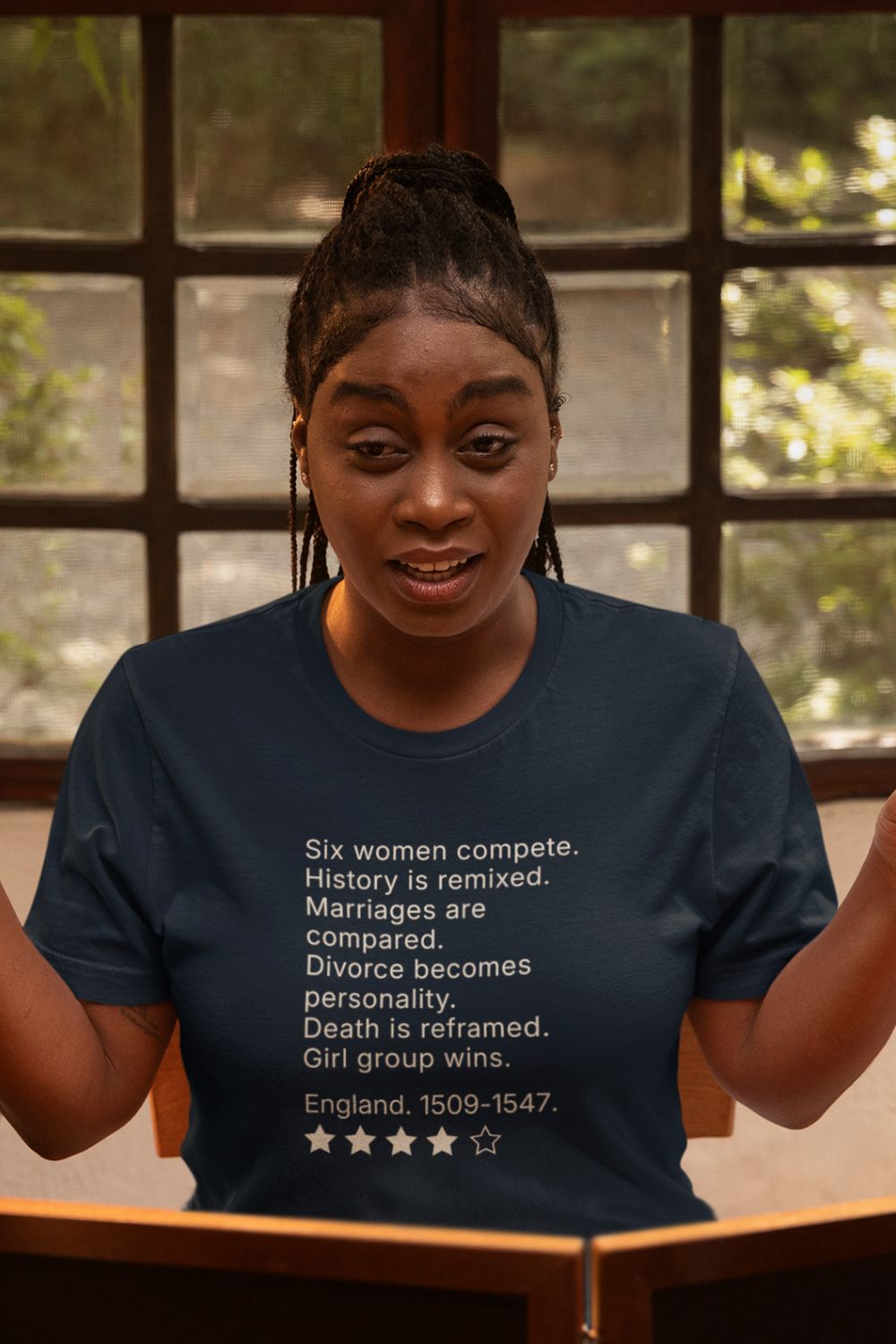 This men’s musical theatre review t-shirt features a concise, text-led print that reframes a familiar Tudor story through modern pop structure and dry observation. Designed for theatre-literate audiences, the humour is intentional and understated, relying on recognition rather than explanation.