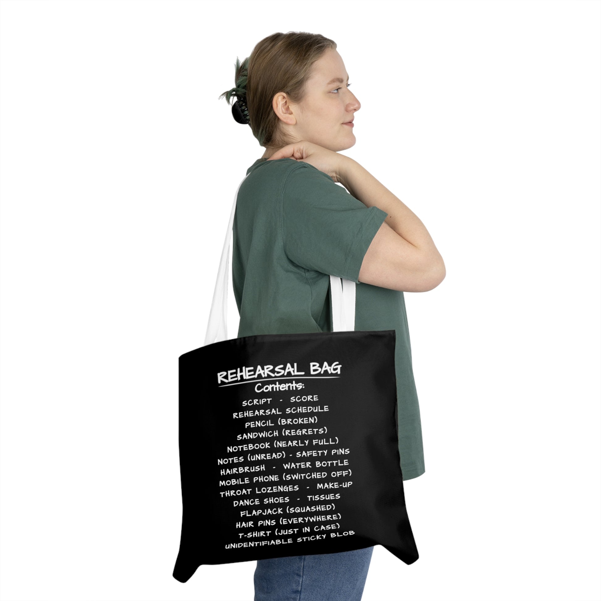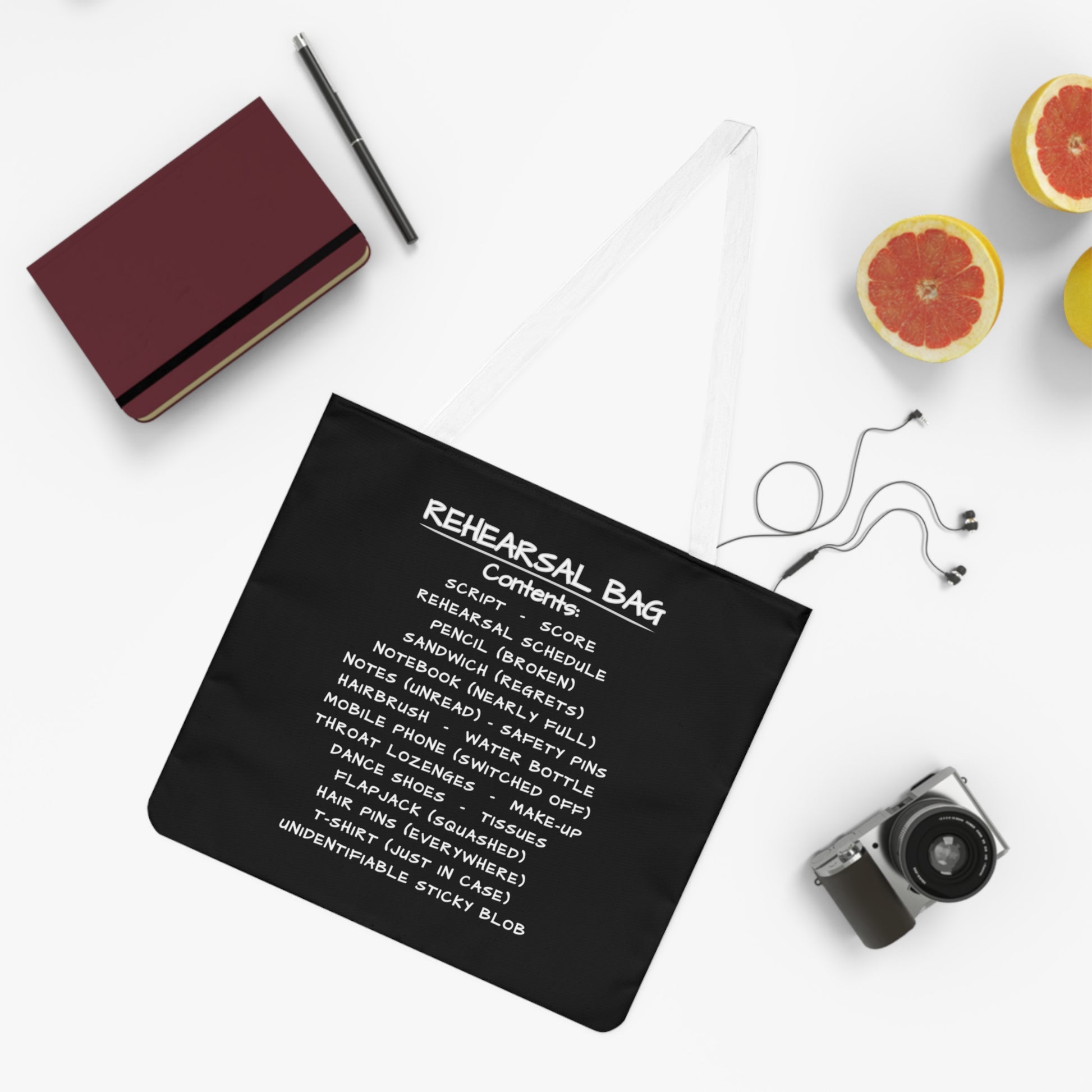 This Rehearsal Bag Tote is a knowing nod to the beautifully chaotic reality of theatre, dance, and creative life. Featuring a quietly humorous list of rehearsal essentials — from Sandwich (regrets) to Notes (unread) — it’s designed for those who live out of their bag and know exactly what that means.