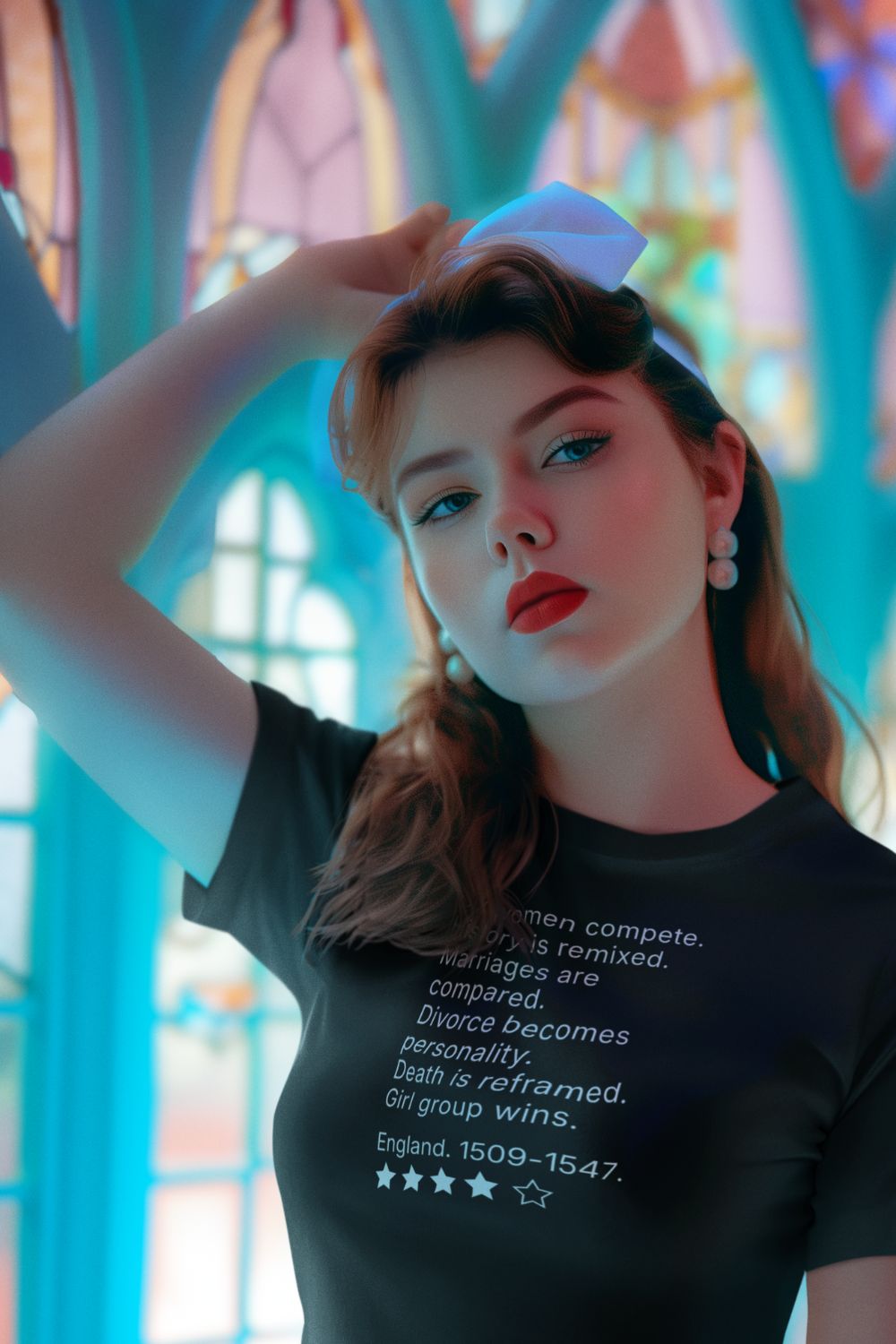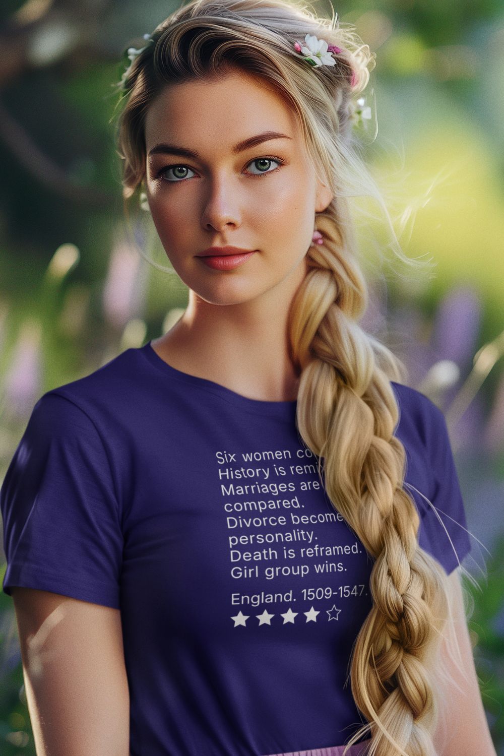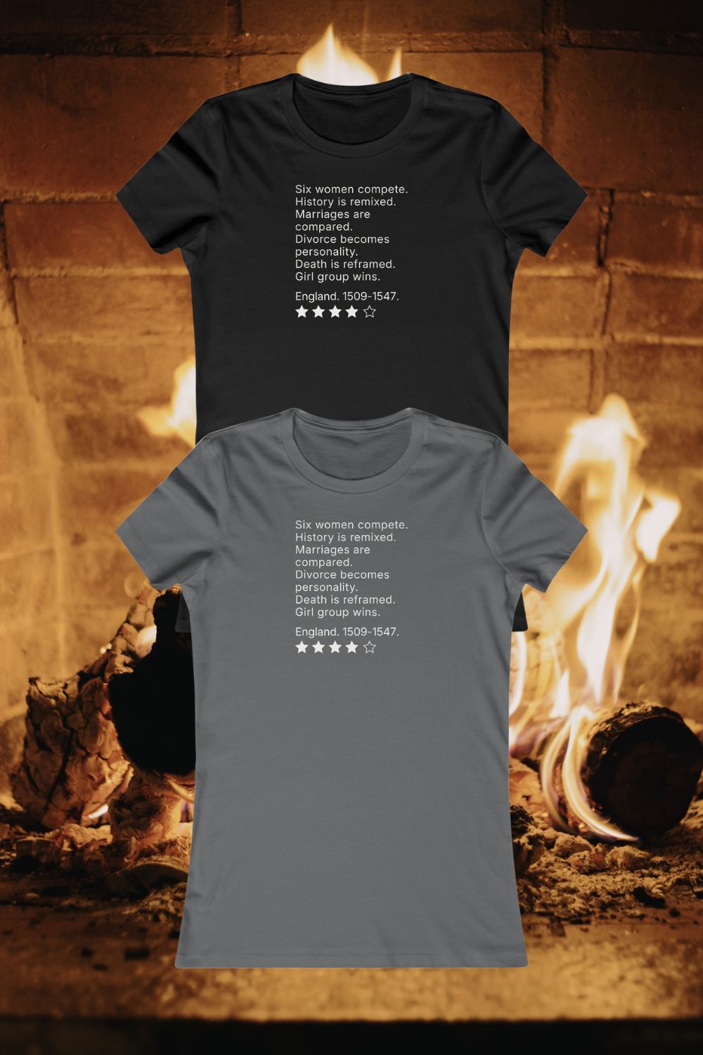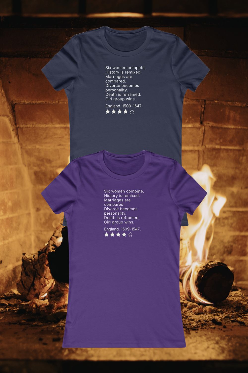 This women’s musical theatre review t-shirt features a concise, text-led print that reframes a familiar Tudor story through modern pop structure and dry observation. Designed for theatre-literate audiences, the humour is understated and confident, relying on recognition rather than explanation. It’s a wearable, editorial piece for musical theatre lovers who prefer their references sharp and uncluttered.